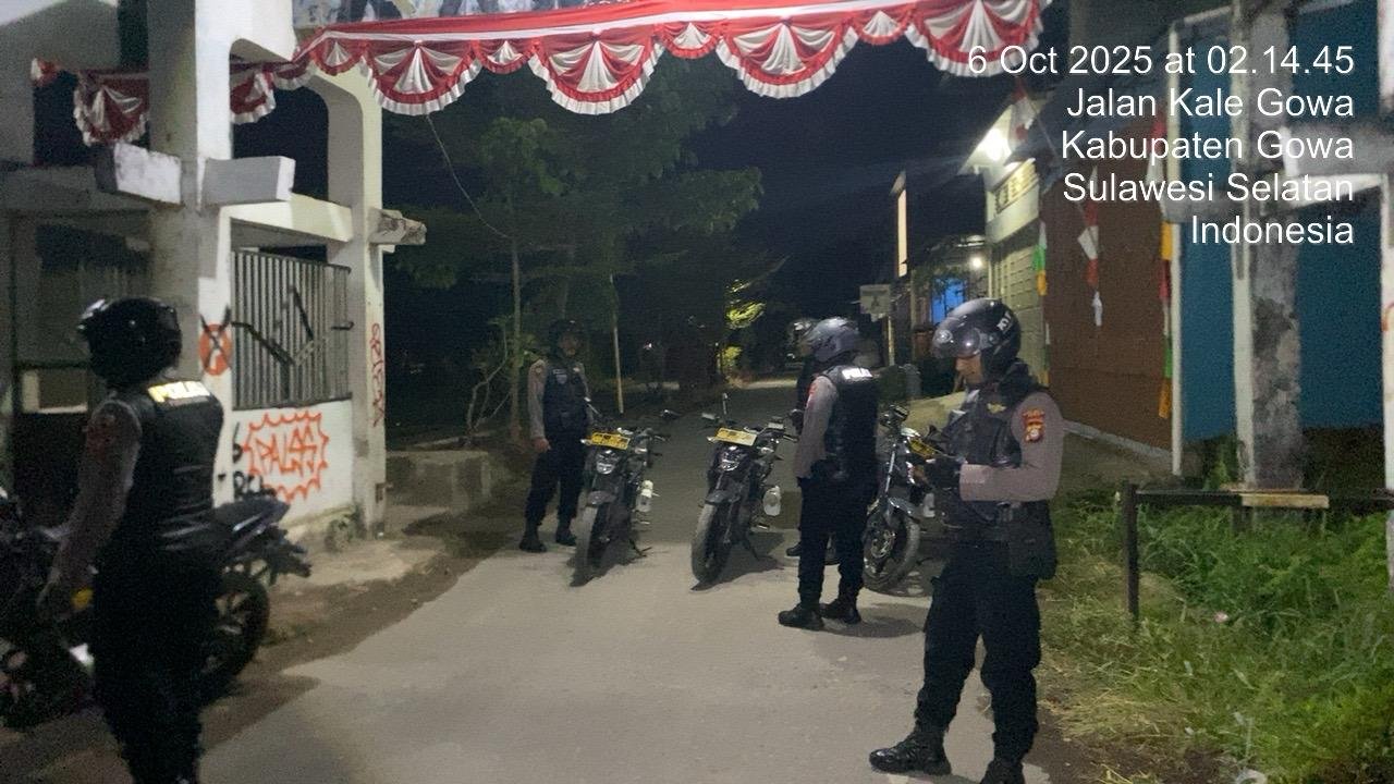 Personel Tim Perintis Presisi Samapta Polres Gowa saat melakukan patroli malam di kawasan rawan kejahatan, Senin (6/10/2025). Patroli rutin ini menjadi bagian dari upaya kepolisian menciptakan rasa aman di tengah masyarakat.