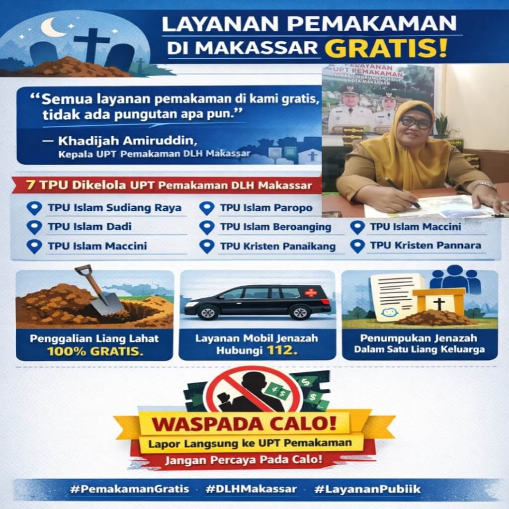 “Jangan percaya calo atau pihak yang mengatasnamakan UPT Pemakaman DLH Makassar. Semua layanan pemakaman di kami gratis,” tegasnya.
