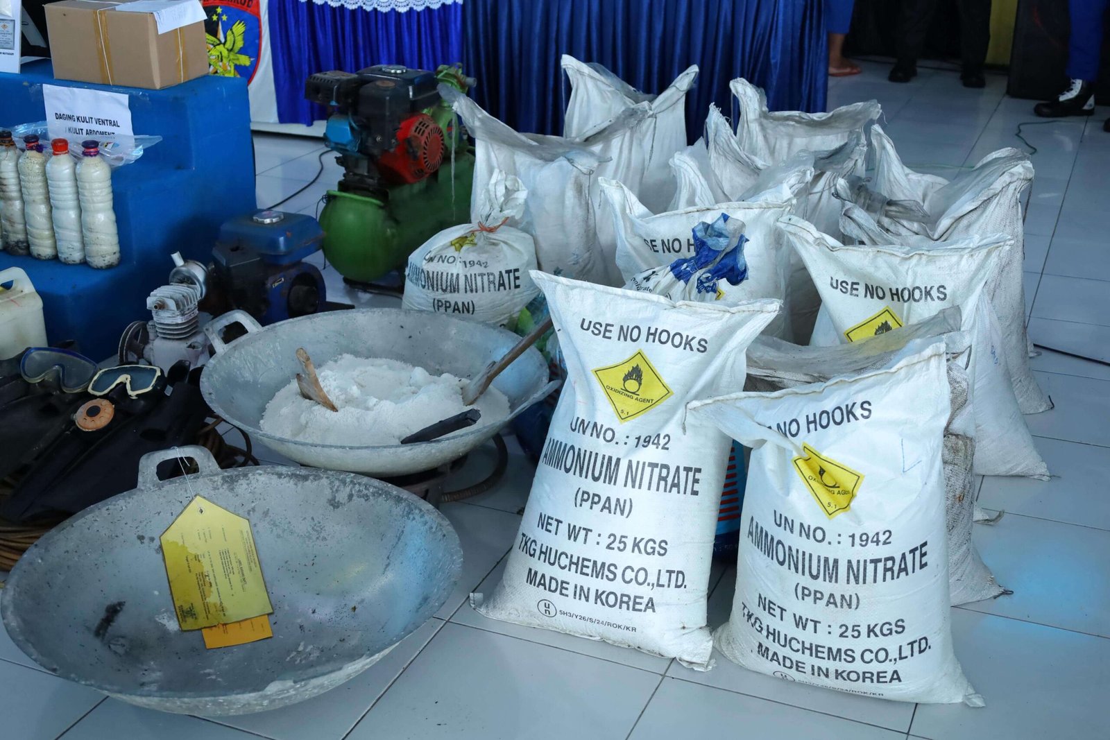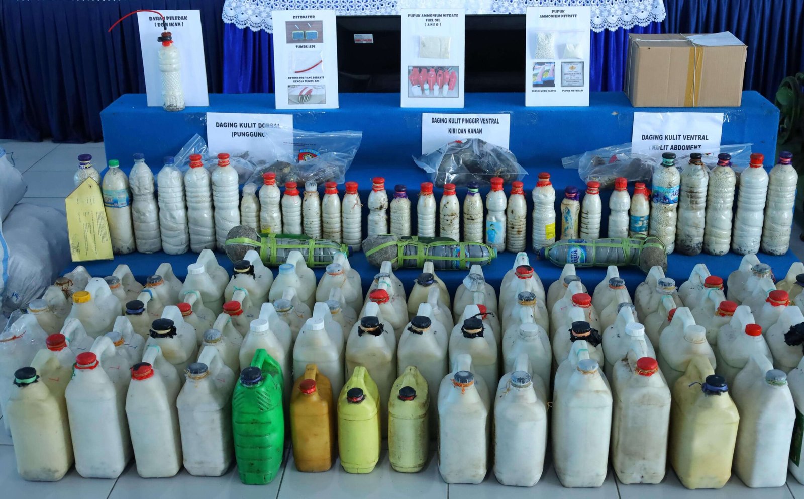 Polda menyita ratusan barang bukti berupa bahan peledak dan perlengkapan pengeboman ikan: 11 karung pupuk (25 kg), 89 jerigen bahan peledak, 64 botol bom siap ledak, 369 detonator, 74 potong sumbu berbagai ukuran, 2 kompresor, 2 gulung selang, 2 pasang kaki katak, 2 dakor, serta 18 bungkus bahan campuran peledak lainnya.